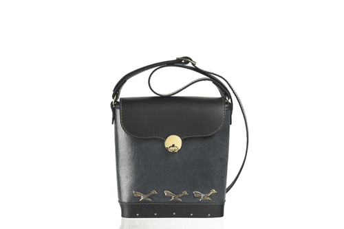 Exterior: Navy leather embossed with stain sheen finish, decorated with 3 vintage roadrunners